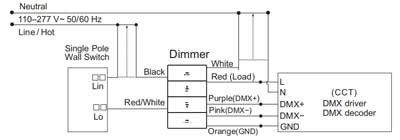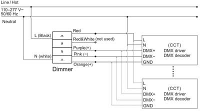 ملاحظة 2: قم بتوصيل سلك الإدخال المباشر للتيار المتردد (L) الخاص بسائق DALI بسلك تحميل جهاز التعتيم (أحمر).