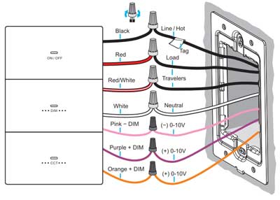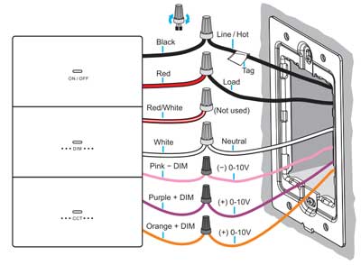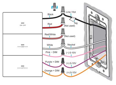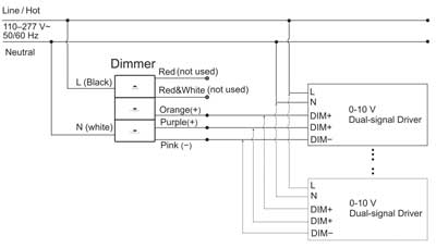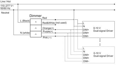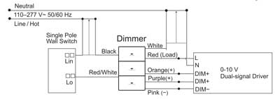 ملاحظة: قم بتوصيل سلك الإدخال المباشر للتيار المتردد (L) الخاص بالمحول/المشغل 0-10 فولت بسلك الحمل الخاص بالمخفف (أحمر).